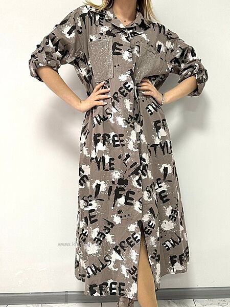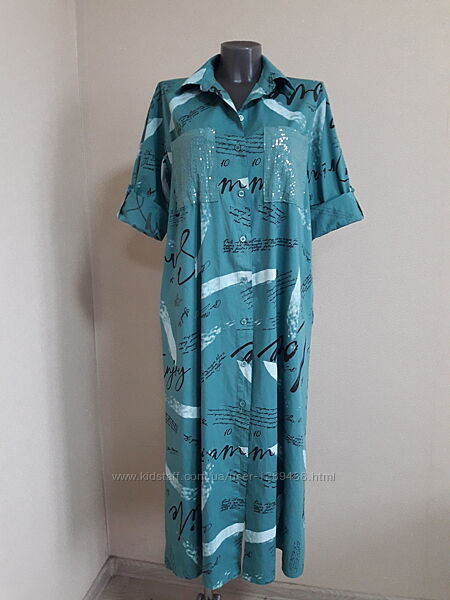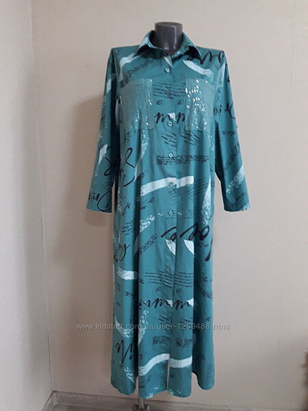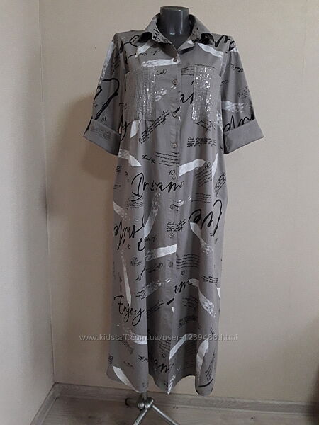 Стильное,эффектное качественное натуральное платье-рубашкаКрасивая,комфортная,стильная повседневная модель!Платье с рукавом 3/4 и с укороченным вариантом с отворотом на пуговице.Модель комфортного кроя,А-силуэта,с большими накладными карманами,декорироваными прозрачными микро-пайетками.Модель на пуговицах по всей длине,с классическим рубашечным воротником.Натуральная,легкая хлопковая ткань-жатка.