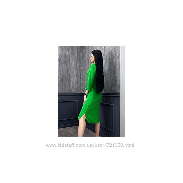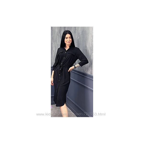 Характеристики сукні "Marcella":- сезон – весна/літо;- фальшиві кишені на грудях;- пряма планка з ґудзиками;- відкладний комір;- довжина сукні - міді (нижче коліна), довжина рукава - ¾, з відворотом;- матеріал – американський жатий креп.Знімний пояс із тієї ж тканини, що й сорочка, дозволяє зробити акцент на талії. Щоб створити оригінальний образ, можна використовувати тонкий шкіряний ремінець замість пояса, що йде у комплекті.