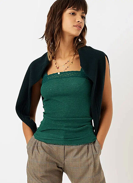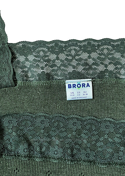 Красивая и суперкомфортная майка с ажурным кружевом от бренда Brora.Идеальный вариант для ношения под кардиганы, джемперы или любые другие вещи в качестве базового слоя, а кружевная отделка привносит женственный штрих в этот практичный топ.