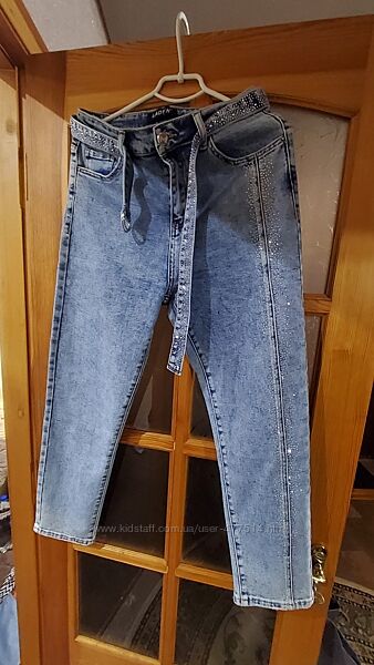 Очень красивые джинсы со стразами, мягкие, на лето бомба! Указан размер 30, но ориенируйтесь по замерам: длина 98 см, пот 37, тянуться, поб 55-56 примерно. Цена распродажи!