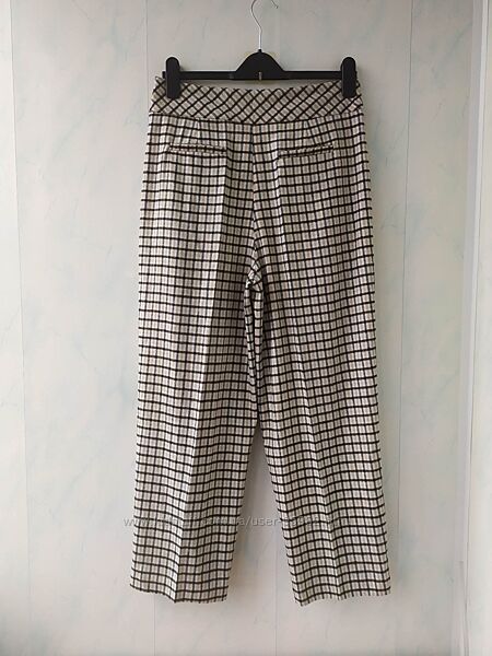 Вовняні штани у клітинку Trussardi Jeans, у складі 21% вовни, укорочені, або на дівчину невисокого зросту теж буде чудово. Висока посадка, крій широкий, вони вільні, як зараз і модно. На бирці 44 (м-ка) розмір, сяде і на невеличку л-ку. Талія регулюється пояском. Якість чудова, бренд не дешевий, можете загуглити)пот — 38, поб — 53, довжина — 97, по внутрішній стороні — 65, посадка 34/42