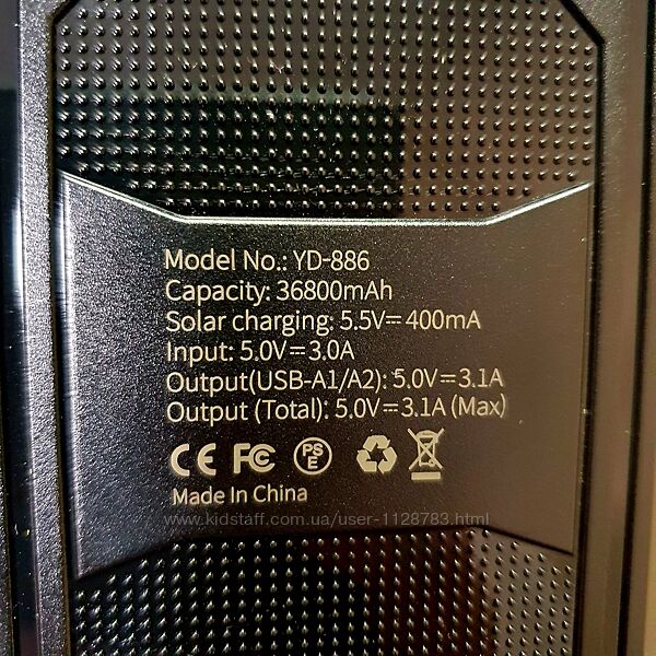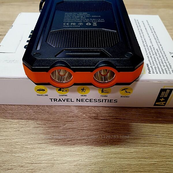 Багатофункціональний пристрій, який працюватиме за будь- яких умов, завдяки зарядному пристрою Solar. 2 USB порту - які допоможуть вам заряджати 2 пристрої одночасно. Завдяки карабіну, який входить до комплекту, можна прикріпити до рюкзака, тому він не займе багато місця. Solar Power Bank містить полімерну батарею (найбільш безпечний спосіб на даний момент) і має інтелектуальний захист від перевантаження, перенапруження, перегріву і короткого замикання. Powerbank має два дуже потужні світлодіоди, що робить його ідеальним ліхтарем навіть у найскладніших умовах. POWERBANK має клас водонепроникності IP6, тому вам не потрібно турбуватися про дощ чи випадкові бризки.- Вказана ємкість 36 800mAh (в звичайному смартфоні приблизно 6000Ah)