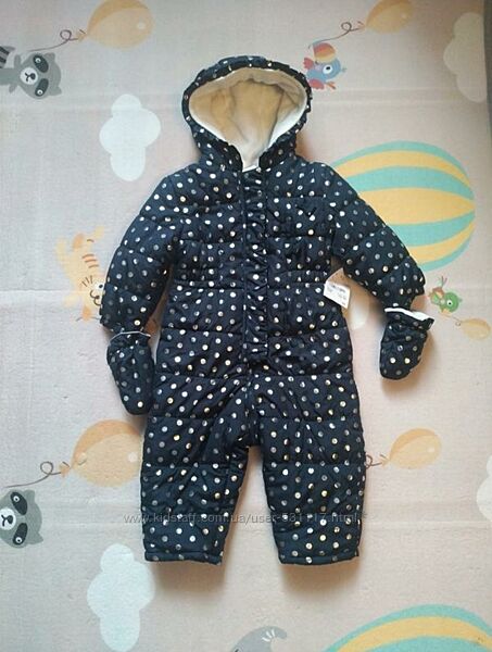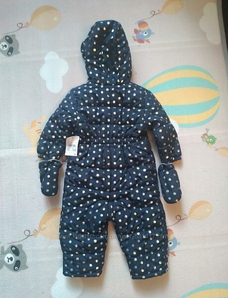 Дуже красивий комбінезон для крихітки на осінь-зиму. По ступеню тепла - єврозима. Ідеальний на осінь і весну, взимку на термобілизну або теплі речі під низ такої можно носити. Абсолютно новий, з усіма бірками. Навіть не примірявся.Дуже красивий темного синього кольору із срібними горохами. не маркий, не прийдеться праці після кожної прогулянки. Декорований бантиками та рюшем на капюшоні. Наповнювач - поліестер, внутрішній шар - фліс. Легкий и теплий. На спинці на талії вшита резиночка, для кращого збереження тепла в середні. Комплекті йдуть рукавиці без пальчика, фіксуються до комбінезона на гудзик. Рукавиці всередині також флісові. На ніжках є прихована резиночка, щоб полотно фіксуватися на нозі.