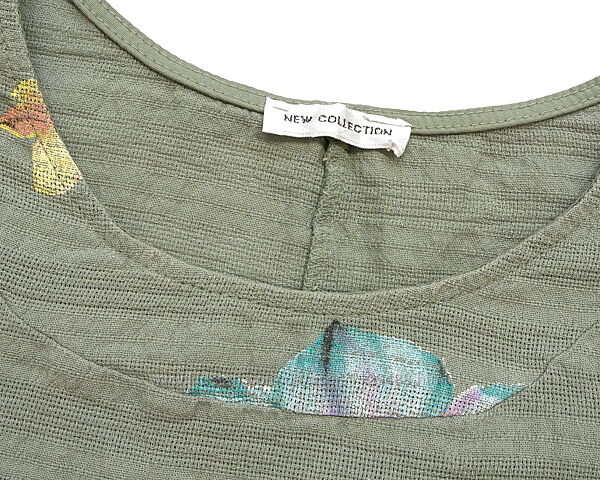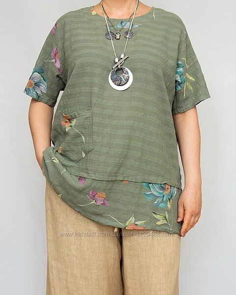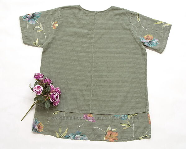 Эффектная, практичная, стильная, удобная. Выполнена из натуральной дышащей фактурной ткани, спокойного нейтрального приглушенного цвета хаки в сочетании с той-же тканью в нежный акварельный цветочный принт. Крой свободный, скрывает все лишнее, не сковывает движений.