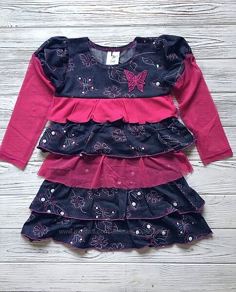Яркий, веселый комплект для девочки - туника с лосинами из стреч-трикотажа, с оборками и декором на груди в виде бабочки.Лосины - эластичная ткань "сеточка"