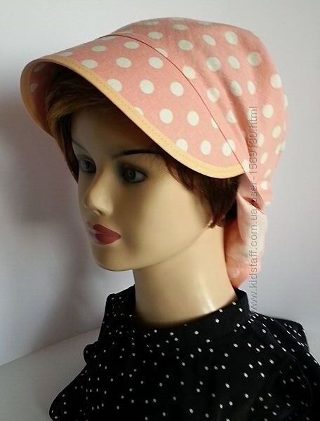 Козырек классический. Окантован качественной косой бейкой светло - персикового цвета в тон ткани.