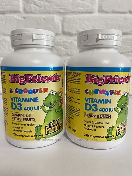Natural Factors, Big Friends, жевательный витамин D3, ягодный вкус, 10 мкг, 250 жевательных таблетокОписание