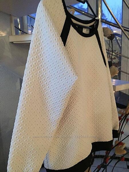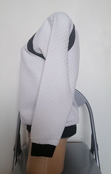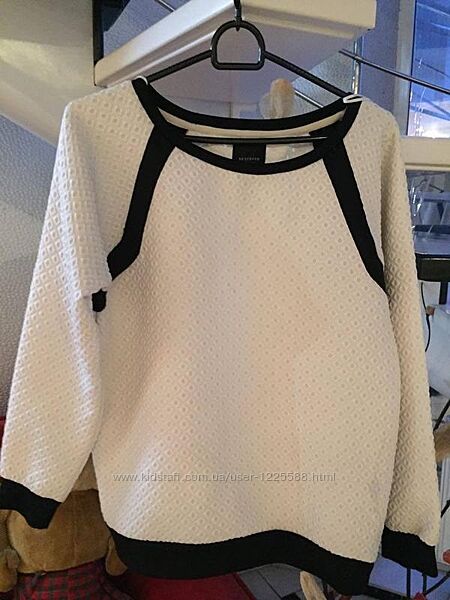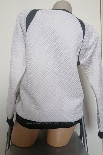 Світшот з структурної тканини в гарному стані. Розмір вказано S, підійде на M-L Нюанс - в районі пахв трохи змінено колір через антиперспірант, ззовні не помітно Заміри: Напівобхват грудей - 51 Напівобхват стегон - 45 Довжина від плеча 62, по спинці 59 Рукав-реглан - 64