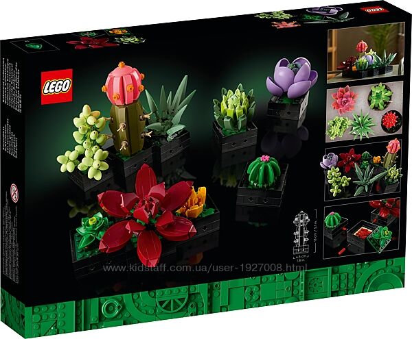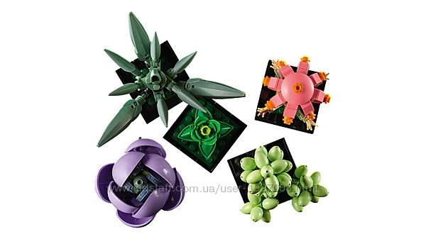 Суккуленты — популярный способ завести растения у себя дома и украсить интерьер. Теперь с набором «Суккуленты» LEGO® (10309) для взрослых вы можете насладиться увлекательной сборкой, создавая элегантную растительную экспозицию для комнаты. Не торопитесь и соберите все детали девяти различных суккулентов — каждый из них сделан на основе настоящего растения. Продемонстрируйте свои творческие способности, создав идеальную растительную экспозицию, не требующую никакого ухода. Ваша собственная композиция Каждый суккулент «растет» в своем собственном небольшом горшке. Вы можете объединить их в одну композицию, расставить небольшими группами или выставить по отдельности у себя дома, в офисе или в общежитии. Этот набор станет отличным подарком для любителей растений, а благодаря трем отдельным буклетам с инструкциями он станет идеальным проектом, которым можно наслаждаться с друзьями и семьей. Создание творчества — деталь за деталью Откройте для себя пространство для размышлений и найдите время для отдыха со сборными моделями из ботанической коллекции LEGO, разработанными специально для взрослых.