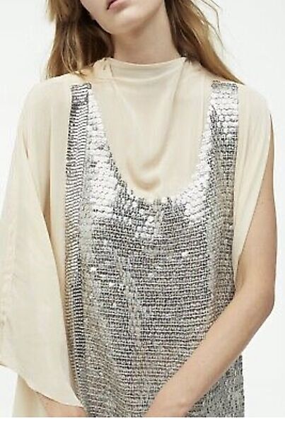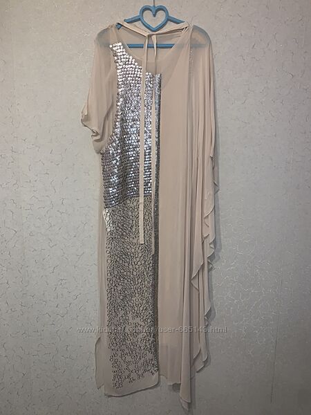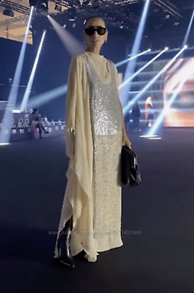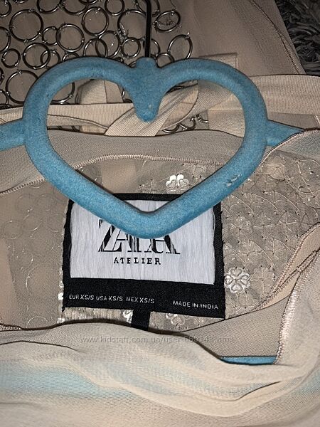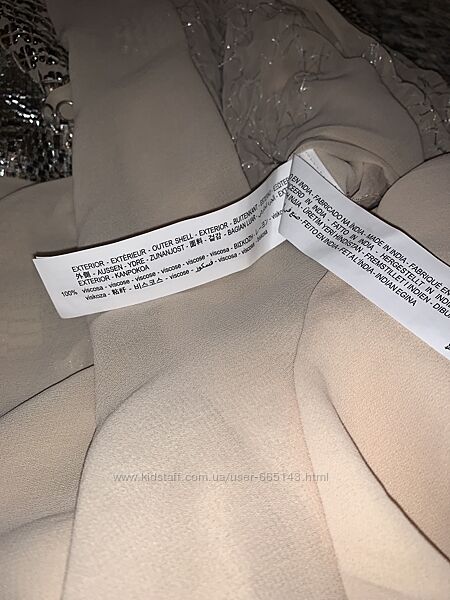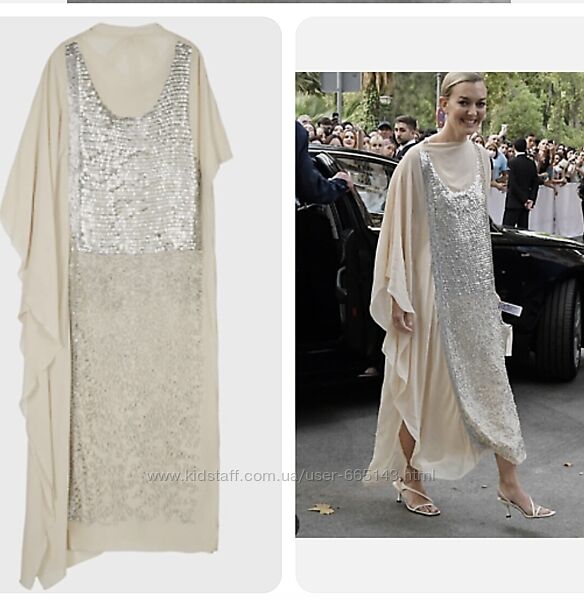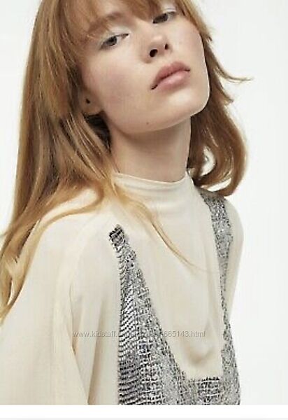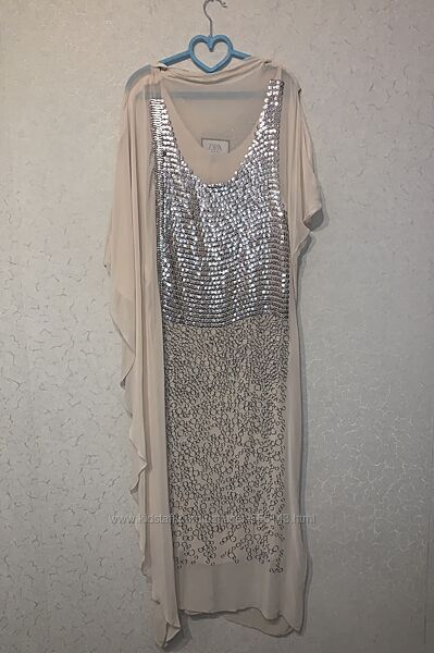 ZaraСукня-кафтан із драпірованим високим коміром, обробленим ніжним бавовняним ремінцем ,який можна зав’язати ззаду. Один довгий рукав. Аплікації з металевих деталей. Внутрішня обшивка в тон. Бічні розрізи дозволяють сукні вільно рухатися.