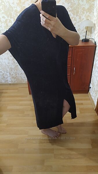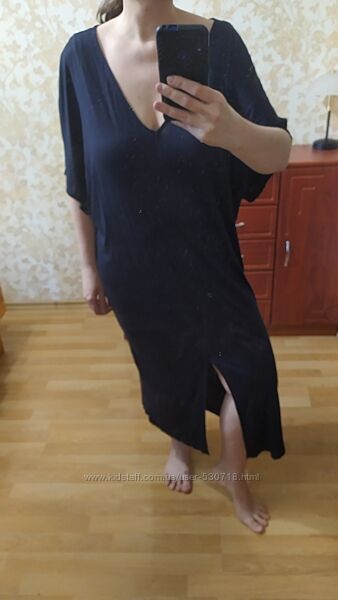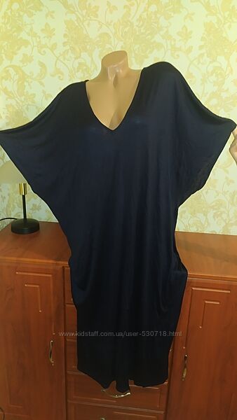 Сукня оверсайз по типу летюча миша темно-синього кольору. Тканина футболочна, віскоза. Підійде як батал, або оверсайз на менші розміри. Гарний стан без нюансів. Для прикладу вдягнена на 48 розмір. Заміри: довжина 118, ПОГ 67, ПОТ 60, ПОБ 57, дуже добре тягнеться.