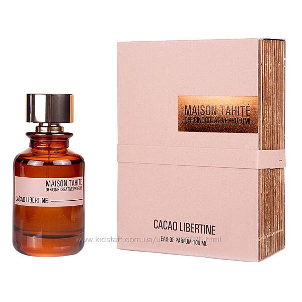 Maison Tahite Cacao Libertine Eau De Parfum — квітковий гурманський пряний аромат, створений у 2021 році. Парфумер — Девід Маріутте (David Maruitte). Проєкт Maison Tahite є ольфакторною лабораторією, що вивчає найяскравіші парфумерні ноти у всій їхній повноті та багатогранності. Свої дослідження лабораторія почала з гурманських нот. Cacao Libertine — розпусний какао, аромат кохання та спокуси, втілення чуттєвості та обжерливості. Грайливий і веселий, він пропонує насолодитися фліртом і смаком. І хто зможе не спокуситися хоча б часточкою шоколаду?