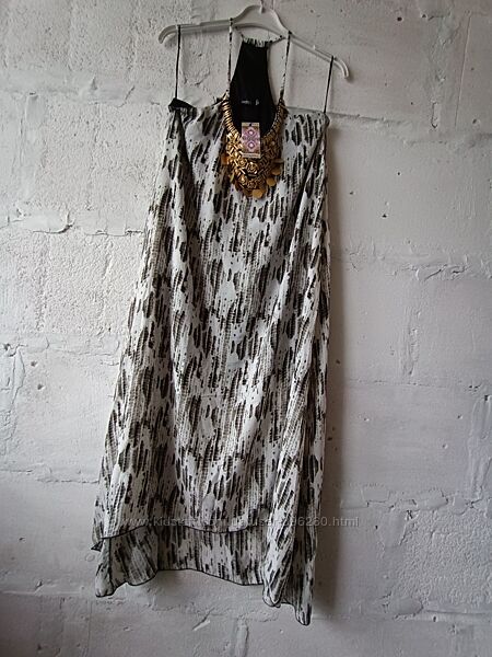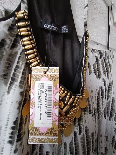 Довгий шифоновий легкий сарафан фірми boohoo, новий, розмір 46-48 (вказано 14). Додаткові заміри: довжина спереду 115 см, довжина ззаду 133 см, напівобхват обхват пахв 46 см, вільний спадаючий крій трапецією. Сарафан з шифону, гарно лягає на фігуру, зсередини короткий чорний чохол, горловина оздоблена золотим пришитим кольє.Робіть свій вибір свідомо, повернення не передбачено.