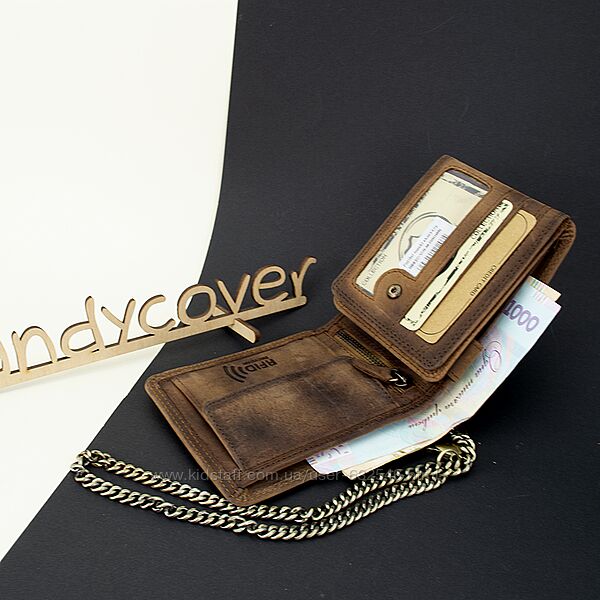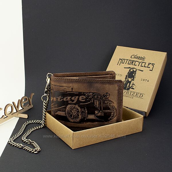 Вінтажне горизонтальне портмоне з натуральної матової шкіри. Виріб має дуже оригінальний та стильний вигляд завдяки витісненому зображенню. Аксесуар зручно лежить у руці. Купюри поміщаються в розгорнутому вигляді та не помнуться. Це портмоне стане ідеальним подарунком прихильнику вінтажних речей, а також брутальному чоловікові, мотоциклісту або байкеру. З таким презентом ви точно потрапите в яблучко. Портмоне без застібки, обладнане вишуканим якісним ланцюжком, другий кінець якого можна пристебнути до петельки джинсів. У портмоне 2 відділення для купюр (перегородки зі шкіри), 9 кишень для карток, 3 прозорих відділень, 1 для дрібниць на кнопці, 1 потайний кишеня на блискавці та 2 без неї. Розмір 11,5*9,5*2,5 см. Спеціальна тканина в підкладці забезпечує RFID захист ваших кредитних карток від електронної крадіжки. Виробництво — Індія. Продається у фірмовій коробці.