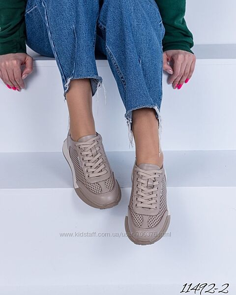 Кроссовки, натуральная кожа с перфорацией, капучино. Кожаная внутренняя часть. Высота подошвы 3/2 см. Размер в размер. Размерный ряд: 36-40. Производитель Украина.