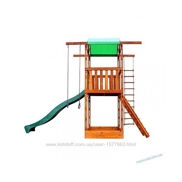 А также дополнительно приобрести к нему песочницу с сиденьями и крышкой, а также деревянную лавочку. Поставляется в разобранном виде.