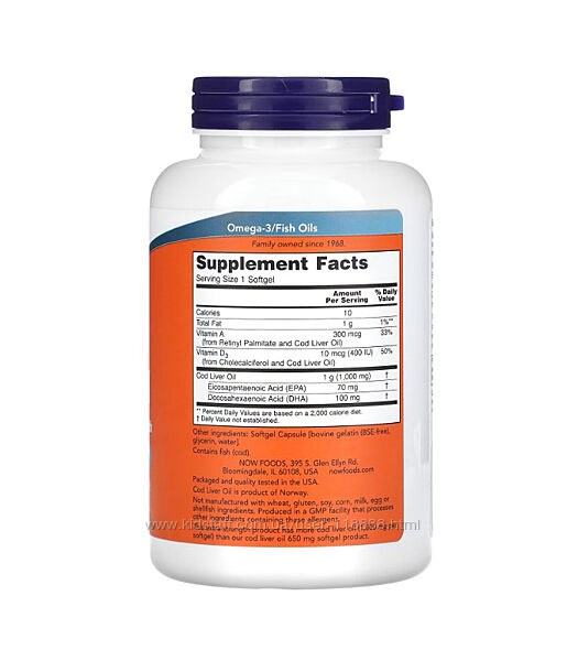Жир печінки тріски від NOW рясніє жирними кислотами омега-3, ЕПК (ейкозапентаєнова кислота) та ДГК (докозагексаєнова кислота). Це також чудове джерело вітамінів А та D3. Жир печінки тріски давно використовується в традиційній медицині для підтримки здоров´я всього організму та гарного самопочуття.