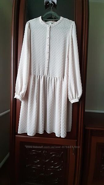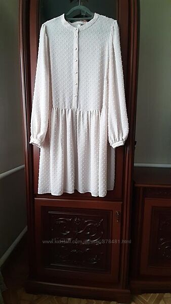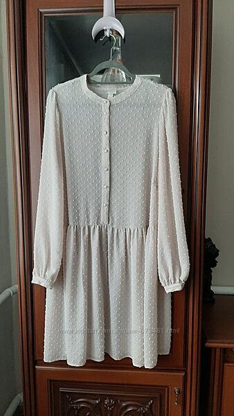 Красивое, воздушное, нежное платье без подклада. Шикарный цвет- нюдовая пудра. Сильно не просвечивает, все в стиле H&M. Актуально, сексуально, лаконично! Выполнено из тонкой структурной ткани в мелкий выделенный горошек. Стильные широкие рукава, слегка присборенные сверху и внизу на тонкой манжете, с застежкой на одну пуговку. Воротник стоечка, застежка спереди до пояса на пуговицах. талия немного занижена, подол свободный в мелкую складку. Обалденно сидит на фигуре, стройнит. Состояние идеальное, как новое! Замеры: плечи-40; ширина по крою рукава-30; длина-64. Под мышками-63; пот-65; поб свободный до 103. Длина по спине- 97. Отправка Новой Почтой, Укрпочтой, обращайтесь