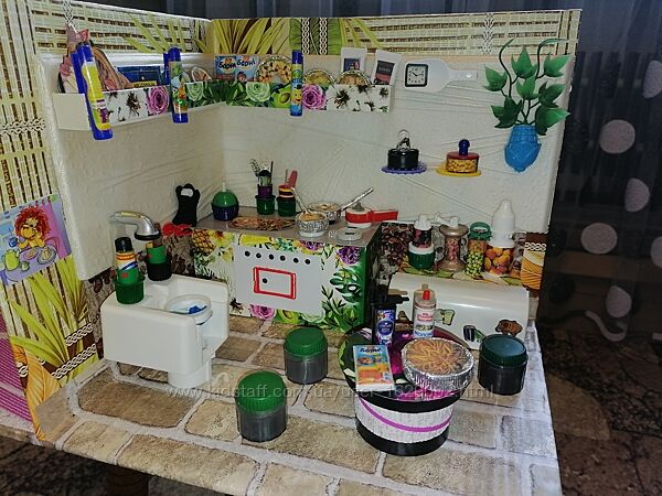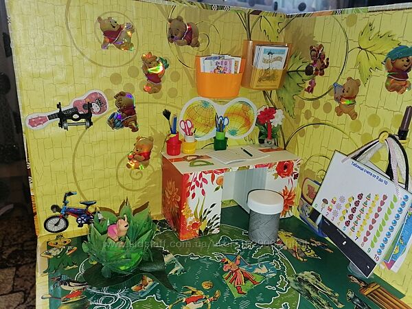 Складається з будиночка, меблів та 126 предметів інтер´єру (крісло, телевізор з картинками мультфільмів та пультом, стіл, стільці, подушки, книги, зошити, альбоми, олівці, ручки, пензлики, лінійки, гребінці, косметика, квіти, для кухні блюда, каструлі, сковорідки, баночки з їжею, кухонний посуд, порошки, шампуні та ішні предмети).