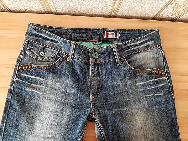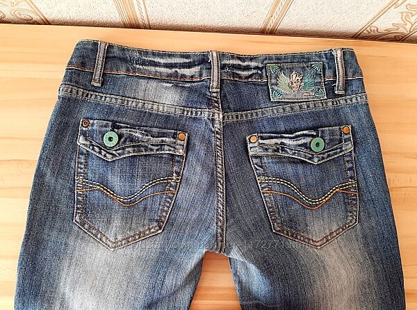 Джинсы женские,очень круто выглядят.Карманы,заклепки,интересные потертости показывают оригинальное изделие.Покупала за границей.Пот-40см,Поб-49см.Длина по внешнему шву-100 см,по внутреннему-84 см.