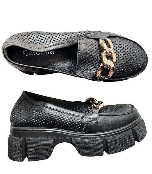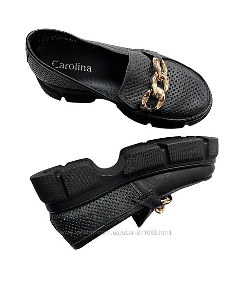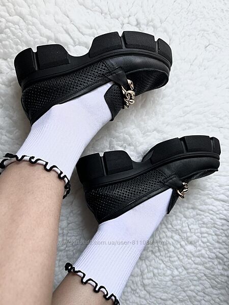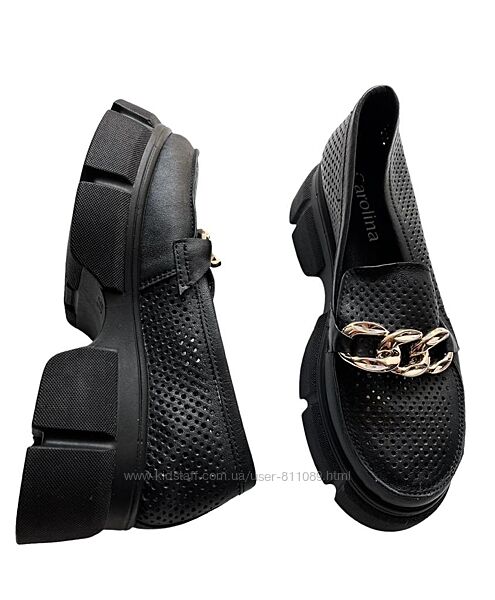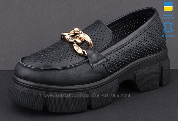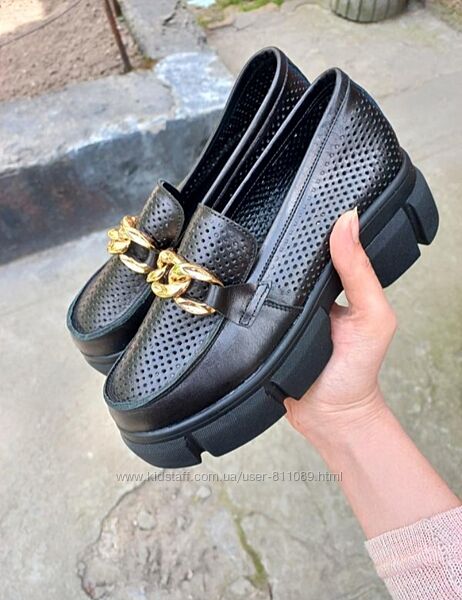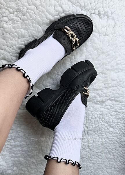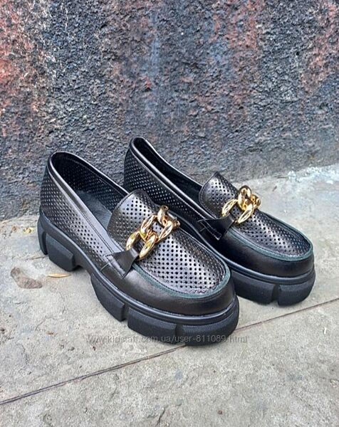 Подробное описание: Чёрные туфли лоферы перфорация с цепью, натуральная кожа