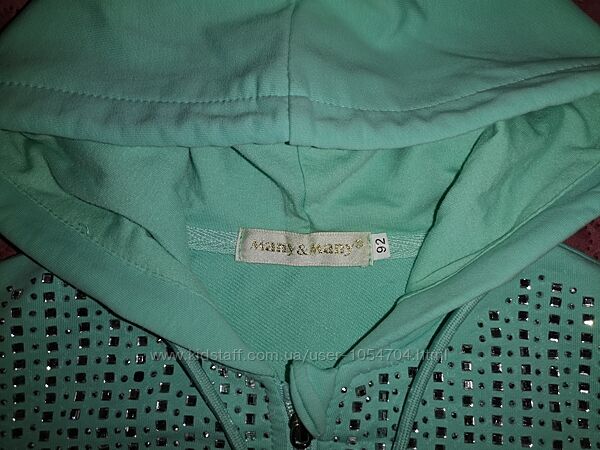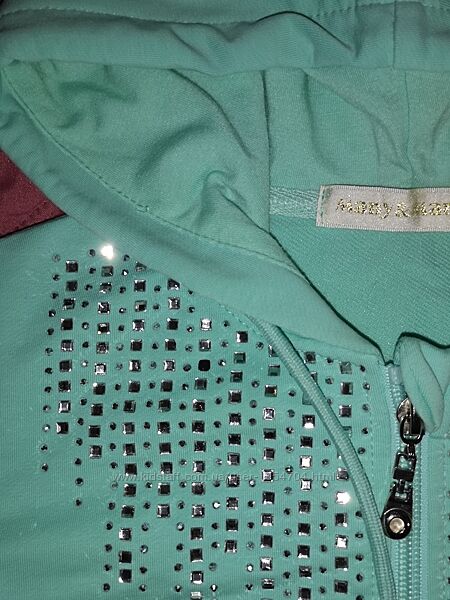 Состав: 95% хлопок, 5% эластин. Размер 92. Одевали пару раз. С недостатков отпал один стразик на кофте.