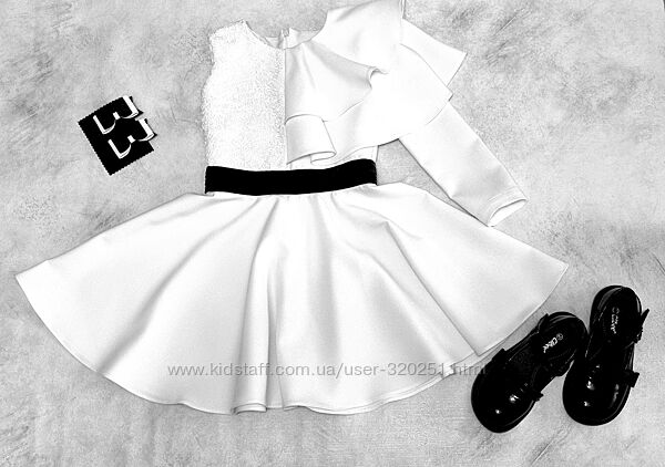 Основна тканина з срібним напиленням, дороге вишукане мереживо, чорна акцентна паєточна стрічка. Також є під"юпник для невеликої пишності.