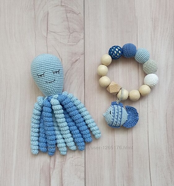 Морской набор для новорожденного 💙 Натуральные безопасные материалы🌿: 100% хлопок, дерево, гипоаллергенный наполнитель.Игрушка осьминог и грызунок - прорезыватель 🐟