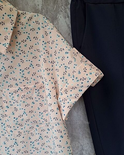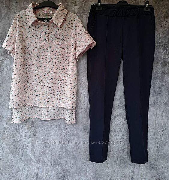 Цвет: блуза -пудровый в цветочек, брюки- темно-синий (вживую оттенок может незначительно отличаться)