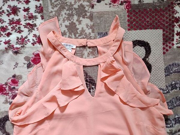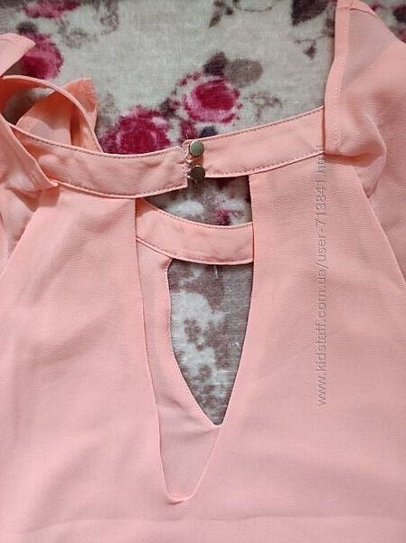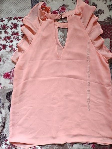 Кофточка выполнена из шифона. Легкая, воздушная. Шикарно смотрится. Красиво оголяются плечи. На лето. Не просвечивается - двойной слой. Романтичные рюшики. На шеи застегивается на две пуговицы. Цвет розово - персиковый. Очень красивый. На фото бледный. Замеры - длина - 60 см, ПОГ - 45 см, в застёгнутом виде ширина шеи - 25 см, пройма от шеи - 26 см, разрез сзади - высота - 17 см, спереди разрез - 10 см. Фирма Amisu, Бангладеш.Другие объявления продавца