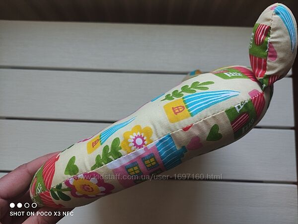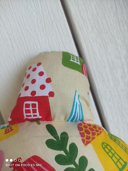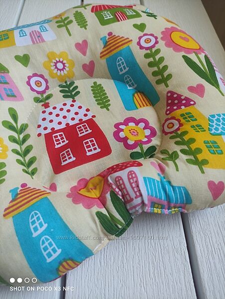 Нова подушка дитяча для малюків з вушками. Для ліжечка, візочка. Тканина: бавовна. Наповнювач подушки : ватний. Подушка по центру без наповнювача (це місце призначено для голови). Ширина подушки 28 см. Висота подушки 26+7 см вушка. Товщина подушки 7 см.