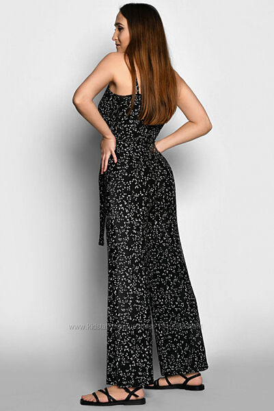 Літній комбінезон у квіточку. Модель з відкритим верхом, вирізом на запАх і тонкими бретелями, що регулюються. На талії зручна еластична резинка. Штани палаццо розширені донизу.*Довжина виробу вказана без урахування бретелів.Довжина: 140 см