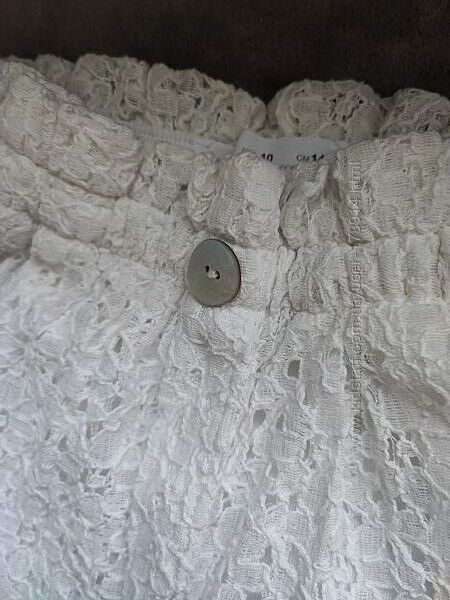 Кюлоты от Zara . Размер 10 (140) Цвет белый. Ткань кружевная , состав не опишу, т.к срезали внутреннюю бирку ( мешала). Внутри есть подклад , мягкий приятный к телу. Модель пошита ниже колена, не до щиколотки. Замеры: длина полностью 76 см. Шаговый 48 см. Ширина в поясе ПО 26 см ( резинка в поясе). Ширина штанины в самом низу 27 см. Состояние отличное. Цена 200 грн.