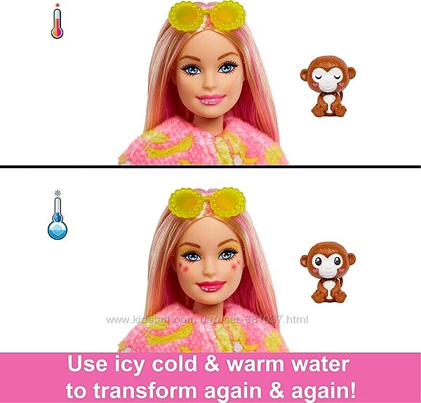 Используйте ледяную воду, чтобы преобразить лицо куклы Барби с помощью раскраски для лица в стиле джунглей и «открыть и закрыть» глаза мини-питомца. Смените обратно теплой водой. Повторяйте снова и снова!