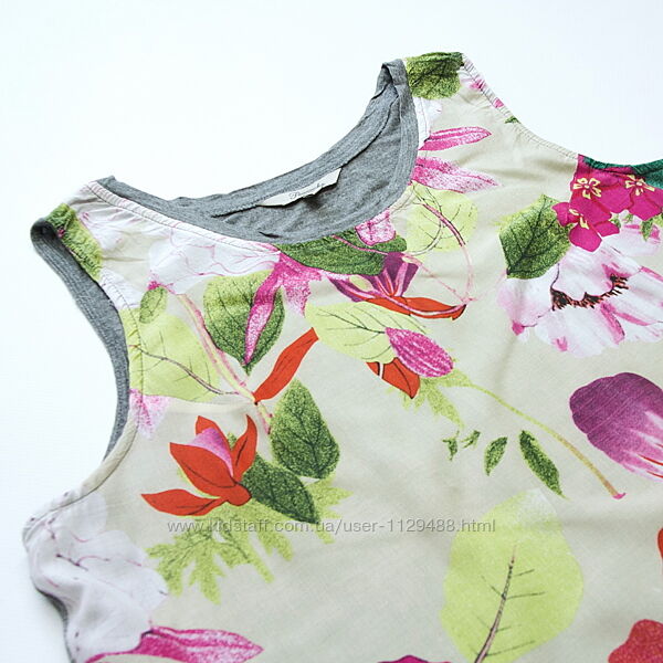 Комфортный, дышащий, натуральный. Перед выполнен из ткани с красивенным цветочным принтом, спинка трикотажная серая.