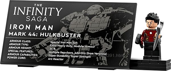 Отличный экземпляр для показа и обсуждения — этот экспонат также включает в себя информационную табличку с минифигуркой Тони Старка.