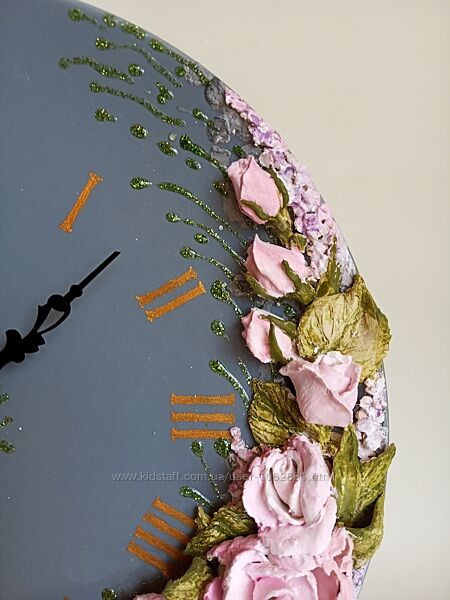 Авторська робота, в єдиному екземплярі. Такий годинник буде лише у вас, бо повтор один в один не можливий!Керамічний годинник з об´ємним букетом з ніжних троянд, бутонів і зелені.