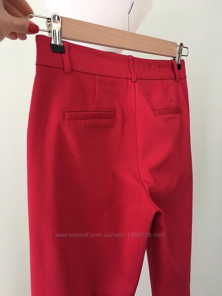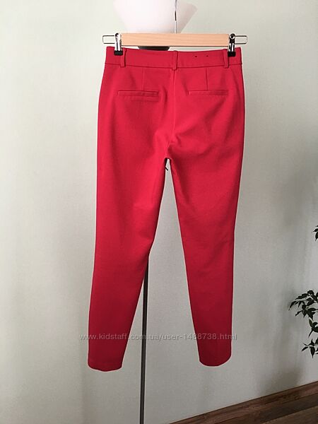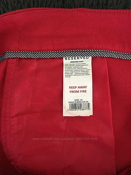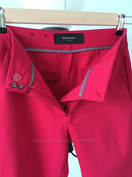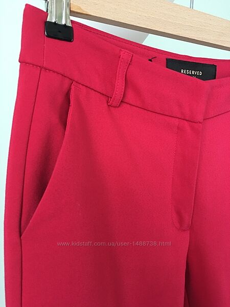 Дуже гарні брюки марки «Reserved». Збоків є кишені. Можна прасувати на кант, дуже гарно виглядають. Колір малиновий, на деяких фото не співпадає. Тканина стрейчева, трішки тягнеться. Стан ідеальний, жодних нюансів.Розмір вказаний 34 але підійдуть на більший