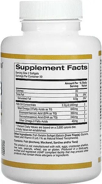Омега-3 рыбий жир премиального качества California Gold Nutrition® * 180 мг ЭПК и 120 мг ДГК * Концентрированный продукт * Произведено с помощью молекулярной дистилляции * Лучшая форма триглицеридов * Поддерживает общее здоровье иммунной системы* * Способствует оптимальному липидному профилю* * Содержит высокорафинированный концентрированный рыбий жир, который поставляется со всего мира. * Капсулы из рыбьего желатина производятся в штате Калифорния, США. Продукт не содержит глютена, ГМО и сои например, снижение риска сердечно-сосудистых заболеваний, здоровая работа мозга, а также хорошее общее здоровье иммунной системы