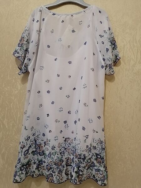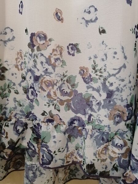 Нова, з биркою. Розмір європейський 42, британський 14. Маломерит. Напевно, на 38-40 європейський. Звіряйте з мірками. Ніжне забарвлення: на білому тлі шифону дрібні рідкісні блідо-лілові та світло-кавові квітки та тіффані листя. І тих же кольорів густий квітковий купон по низу та на рукавах. Фото купона крупним планом відбиває забарвлення більш точно. Блуза на тонкій підкладці. Рукави - реглан. Перед коротше спинки плавним переходом по колу.