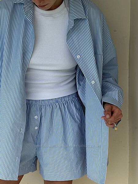 Шорти з ґудзиками попереду, мають розрізи з обох сторін і кишені. Сорочка вільного крою також із маленькими розрізами.