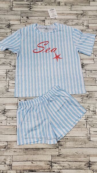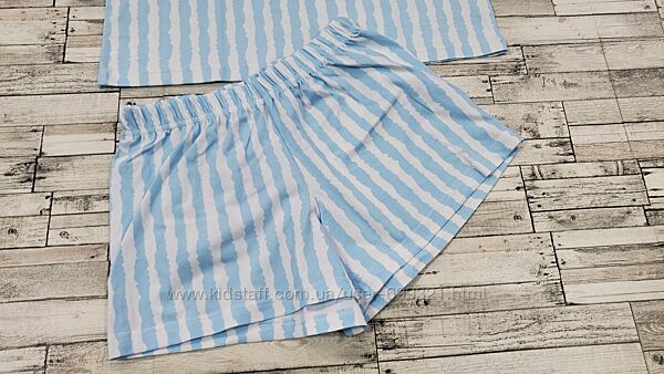 Жіноча піжама блакитного кольору в білу смужку, виготовлена з натуральної бавовни. Футболка з яскравим графічним принтом та шорти з вшитою гумкою. Тканина м´яка та приємна до тіла.р.S продана