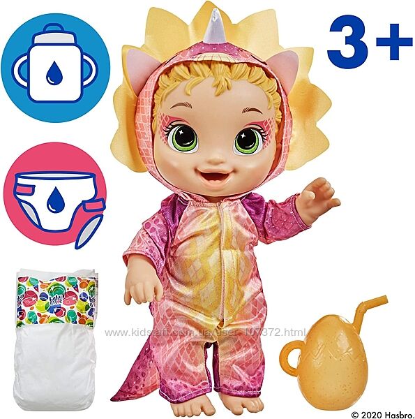 В еко упаковціПознайомтесь із Baby Alive Dino Cuties: затишна банда динозаврів, яка завжди готова до гри! Що сьогодні діти робитимуть зі своєю лялькою Dino Cuties? Чи підуть на сафарі по джунглях? Чи влаштують піжамну вечірку з усією командою Dino Cuties? Ця чарівна лялька Baby Alive Dino Cuties одягнена у яскравий знімний комбінезон у стилі трицератопсу та відповідним капюшоном. Вона також має кумедну прикрасу обличчя, натхнене рептиліями. Крім того, ця лялька, яка п´є і писає, включає пляшечку у формі яйця динозавра і підгузник для перевдягання! Ця лялька Baby Alive Dino Cuties - чудова іграшка-динозавр Трицератопс для дівчаток та хлопчиків віком від 3 років і старше. Він також стане чудовим подарунком любителям динозаврів на дні народження та свята.