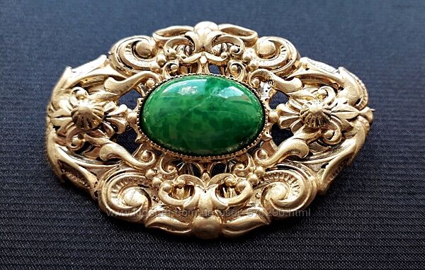 Винтажная брошь Чехословакия c центральной вставкой из зеленого пекинского стекла под малахит.