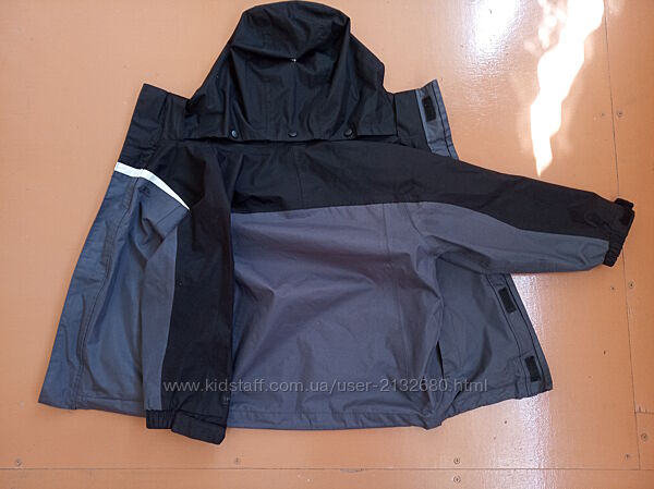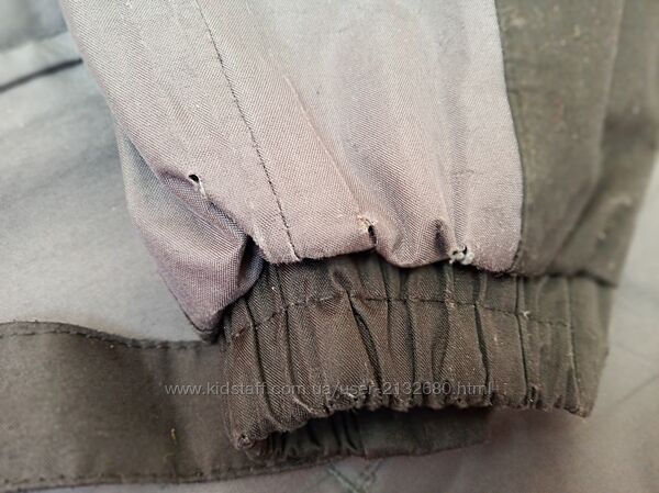 Знизу має стягуючі шнурочки, які можна використоввати, коли задуває вітер. Обидві кишені на замочках. Капюшон можна повністю відстібати, на кнопках. Спереді застібається відразу на 2 замочки, обидва справні. На кінцях рукавів липучки, за допомогою яких можна регулювати ширину рукавів.