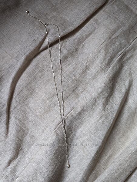 Універсальна срібна прикраса з перлиною. Прикраса виконана зі срібла 925 проби. Довжина виробу 40см + 4 см ланцюжок для збільшення довжини. Перлина має форму рису, її розмір 4-5 мм. Також є ще одна перлинна бусинка на ланцюжку для збільшення довжини.У комплекті до прикраси йде мішечок для зберігання та серветка для догляду за виробом.