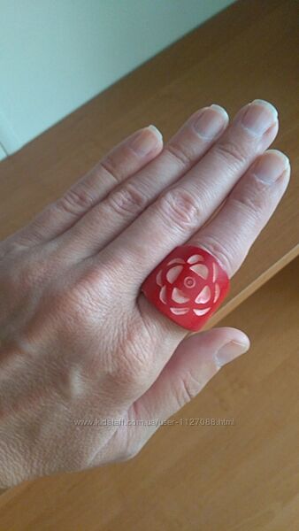Оригінальне красиве кільце вишневого кольору. Велике, але легеньке. Матеріал схожий на дерево. Прикрашене різьбленням. Приблизно 18-й розмір. Водою не мити. Повернення не передбачено.