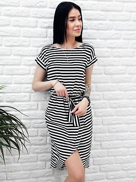Смугастий принт і довжина міді – універсальне модне рішення, яке традиційно популярне в літні сезони. Ця сукня ідеально підійде для базового гардеробу в теплу пору року.