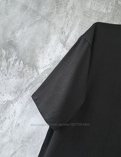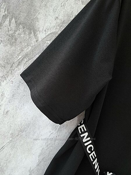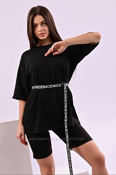 Футболка оверсайз прямого кроя с рукавом до локтей, пояс в шортах на эластичной резинке. Для регулировки области талии на футболке предусмотрен тканевый пояс в буквенный принт.