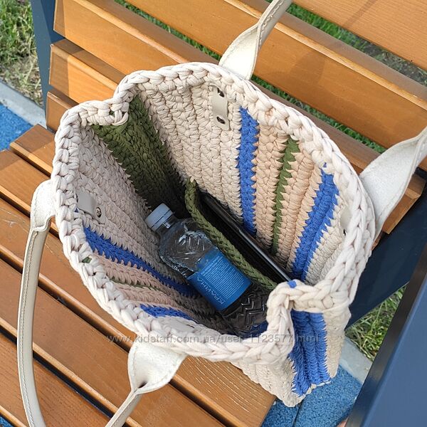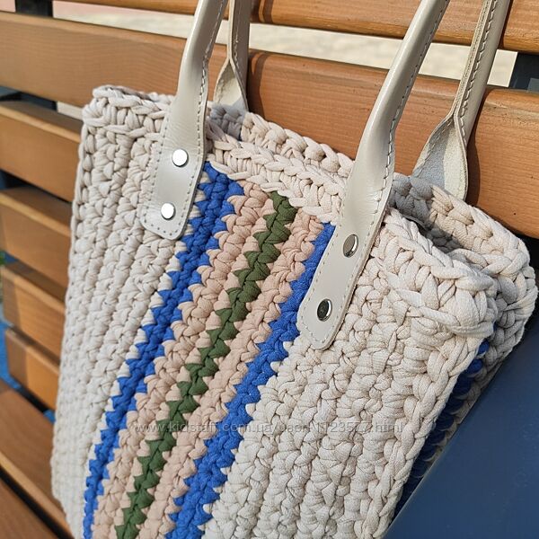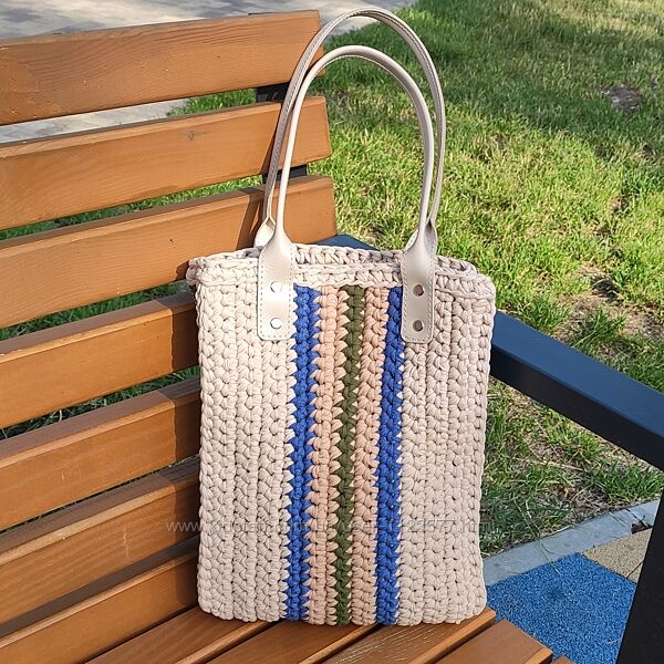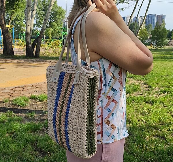 Сумка ручної роботи виконана з трикотажної пряжі гачком. Шкіряні ручки зручної довжини (65 см) дозволяють носити сумку як на плечі, так і в руках.Модель авторська, повністю індивідуальна.